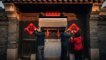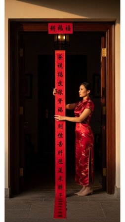 Lunar New Year decorating with red paper couplets featuring gold calligraphy a traditional cultural element placed on the door frame.