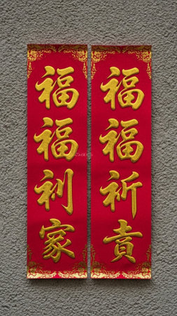Chinese New Year couplets with black calligraphy hung vertically on a traditional doorway a vibrant red paper decorating tradition for the seasonal event.