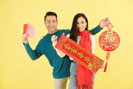 Couple showing Chinese decorations
