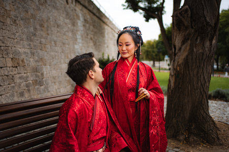 Happy interracial couple celebrating wedding day in traditional Hanfu attire