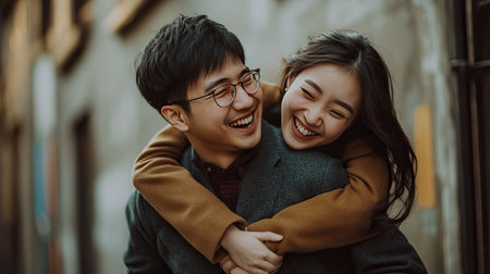 Young asian adults smiling outdoors in casual urban setting