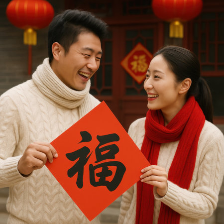 Smiling couple in winter sweaters holding red paper with fu character. Lanterns and traditional decorations in background.
