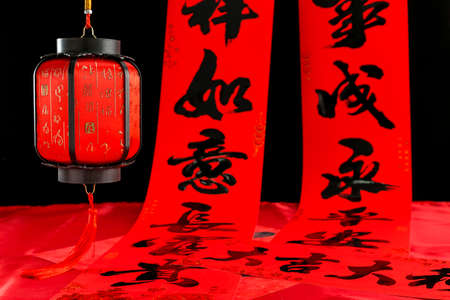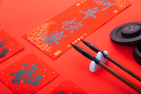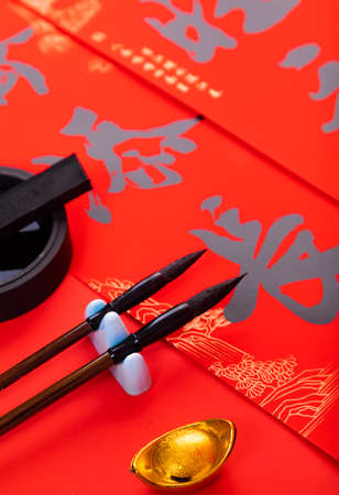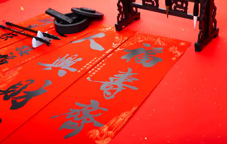 People write Spring Festival couplets with brushes to celebrate Chinese New Year. Chinese traditonal art. Foreign text chinese calligraphy characters means good fortune.