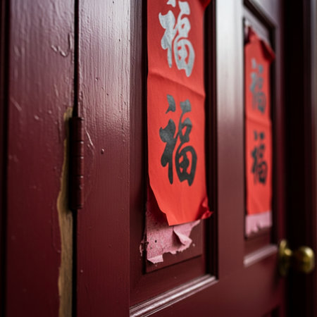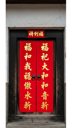 Lunar New Year decorating with red paper couplets featuring gold calligraphy a traditional cultural element placed on the door frame.