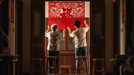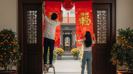 A man and woman collaborate to hang large red and gold Lunar New Year banners (Chun Lian) in a wide,