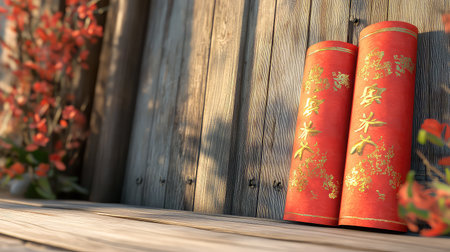 Two traditional red scrolls featuring exquisite gold calligraphy resting on a wooden surface, framed by vibrant orange leaves, embodying cultural heritage and festive spirit.