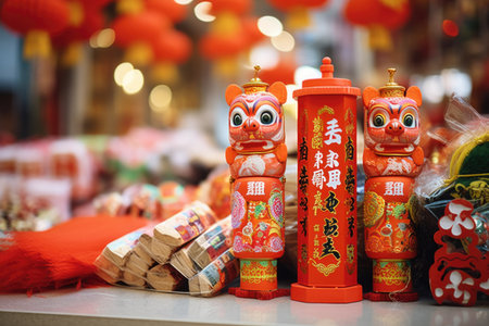 Chinese New Year materials such as couplets, firecrackers and rat soft toy