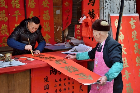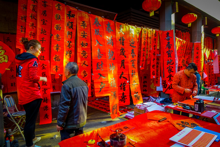 FOSHAN, CHINA – CIRCA JANURAY 2016: calligraphers are writting spring couplets („chunlian“ in Chinese) for the celebrating Chinese New Year