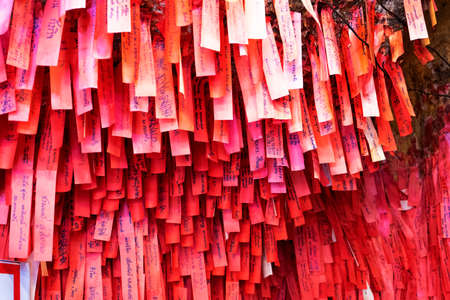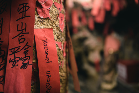Side view on red plates with inscriptions on the temple wall of the Ten Thousand Buddhas Monastery in Hong Kong. Hong Kong is popular tourist destination of Asia.