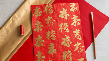 This vibrant image captures the essence of Chinese New Year with red envelopes and calligraphy brushes. Ideal for celebrating culture and tradition.