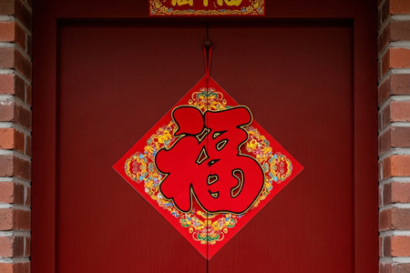 Lucky happiness ritual ornament hanging on a door marks the start of the seasonal Chinese New Year celebration.