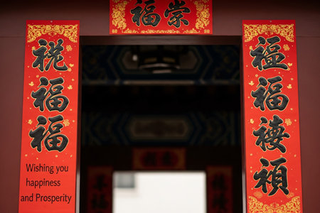 Oriental tradition couplets or Duilian decorating a doorway showcasing sharp focus on the vibrant red paper and brush calligraphy detail.