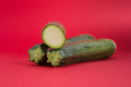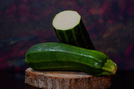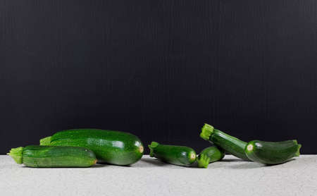 Three zucchini on a dark background. Organic eco food. Healthy diet. Freshly picked vegetables. Fresh greens for salad. Natural organic food. Edible vegetable background