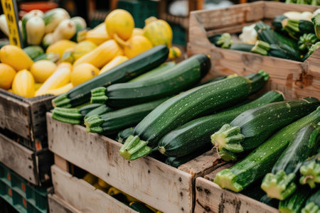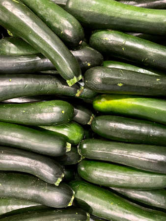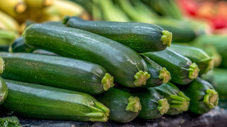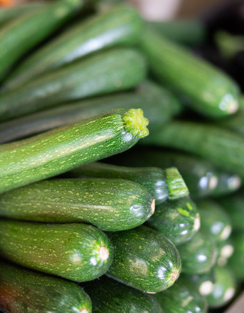 Stacked fresh, green zucchini creates a vibrant display at a local market, showcasing the beauty of healthy, organic produce