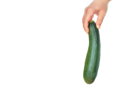 Hand with zucchini on a white background. Woman with zucchini in hand. Vegan cuisine. Healthy vegetables.