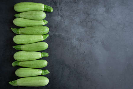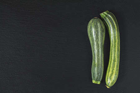 Two striped fresh green zucchini on a black stone surface. Top view, copy space. Healthy eating concept.