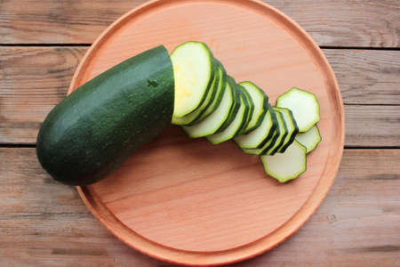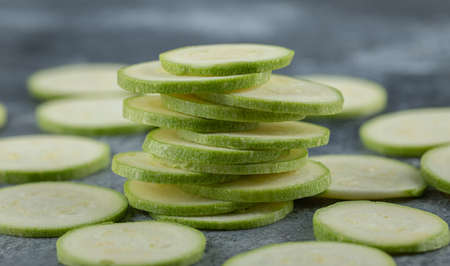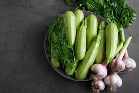 A plate with ripe zucchini on a gray background. Top view, copy space.