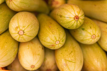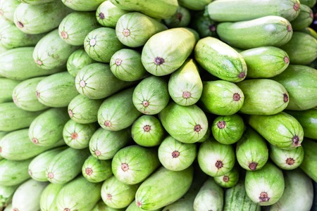 Round marrow at the market closeup. Organic product suitable for vegetarians and vegans. Healthy food concept