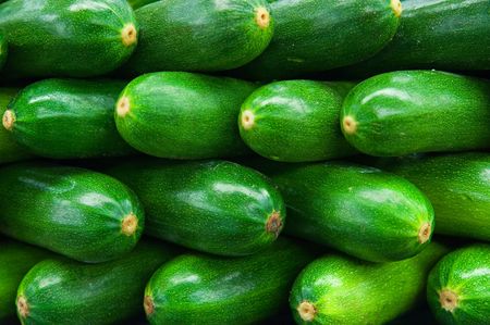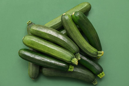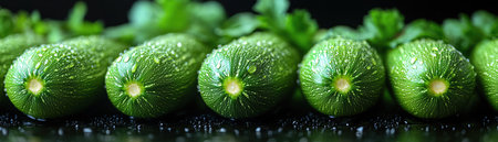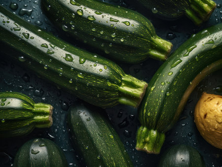 Dewcovered zucchinis, arranged in abundance, with rich green color and natural lighting
