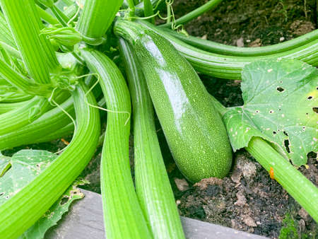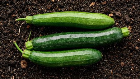 Fresh zucchinis on dark soil green vines attached glossy skins standing out
