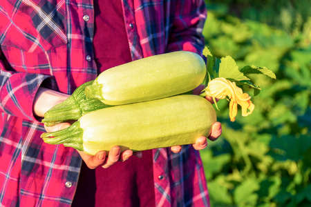 Human hands holding squashes against green kitchen garden. Female farmer with harvest of zucchini in summer sunny evening at sunset. Cultivated vegetables, farming, harvesting concept. Organic food.