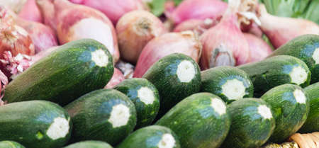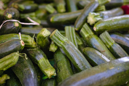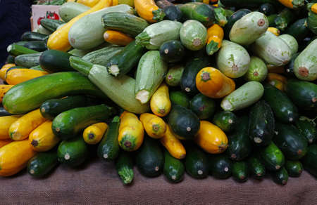 Close up fresh new green and yellow zucchini on retail display of farmers market, high angle view