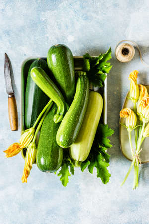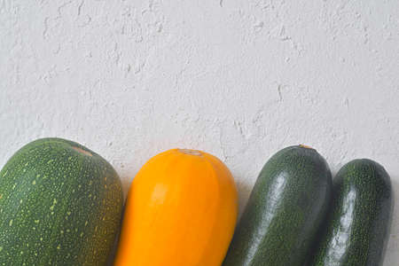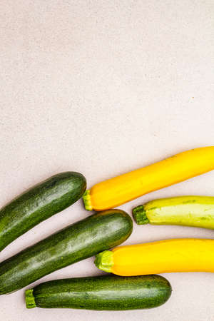 Assorted colorful zucchini. Fresh vegetables for cooking. Harvest on stone background, copy space, top view
