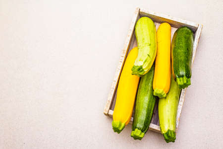 Assorted colorful zucchini in wooden box. Fresh vegetables for cooking. Harvest on stone background, top view, copy space