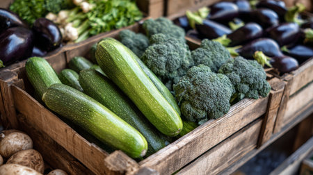 Vibrant fresh vegetables displayed in wooden crates at an outdoor market feature broccoli, zucchini, and eggplant, showcasing healthy food choices.