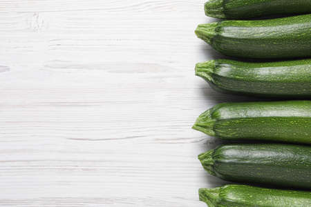 Raw ripe zucchinis on white wooden table, flat lay. Space for text