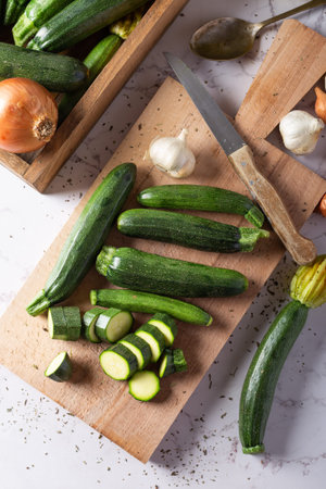 Green fresh ripe zucchini whole and cut into slices on a cloth napkin surrounded by sprigs of parsley, garlic cloves and lemon slices.