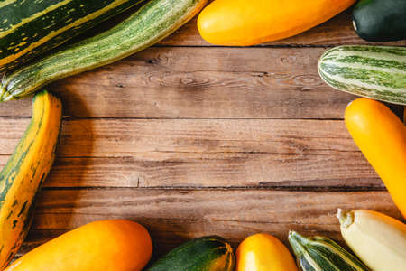 Multicolored assorted zucchini on a wooden table. The view from the top. Space for text