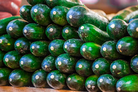 Heap of green fresh cabbages and squash marrow row at wholesale market. Healthy natural ripe vegetables background. Farmers product store.