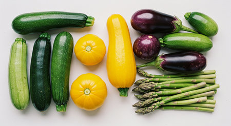 Top view of assorted fresh vegetables including zucchini, yellow squash, eggplant, round yellow squash, and asparagus, neatly arranged on a white background. Healthy food, vegetables