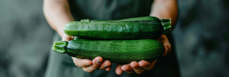 Fresh zucchini selection held in hand with blurred background, copy space available