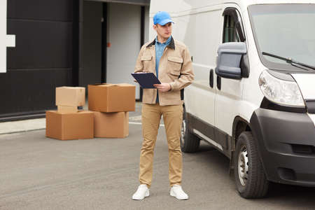 Young man filling the document and making a cargo shipment he loading boxes into the van