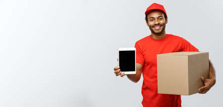 Delivery Concept - Portrait of Handsome African American delivery man or courier with box showing tablet on you to check the order. Isolated on Grey studio Background. Copy Space.