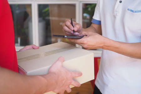 Delivery mail man giving parcel box to recipient, Young man appending signing in digital mobile phone receipt of delivery package from post shipment courier at home.