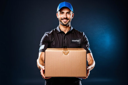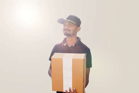 African male postal delivery courier man holding delivering package boxs and cardboard