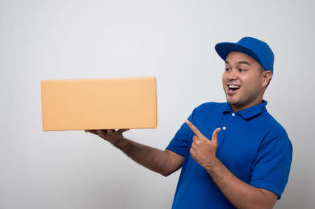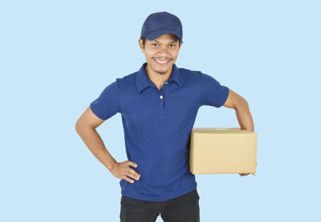 Young smiling asian delivery man in blue uniform holding box parcel cardboard on isolated white background.
