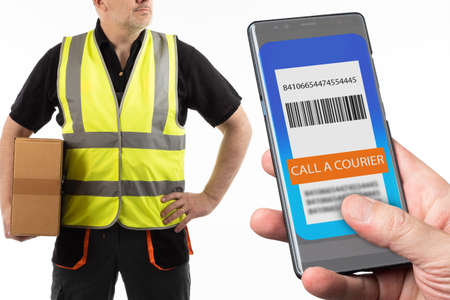 Call courier. Courier application in smartphone screen. Man with parcel next to phone. Calling courier through application. Logistics company apps. Delivery service. Apps for work as delivery man
