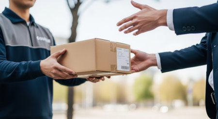 Efficient package delivery: quick exchange between courier and client outdoors. High quality illustration