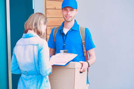 Express courier delivering cardboard box order to customer - Deliver and online buying concept