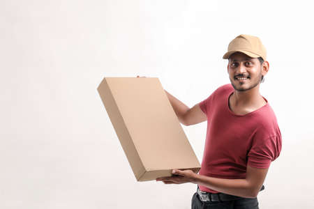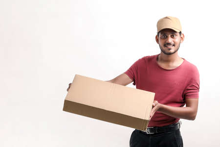 Portrait Of Young Delivery Man Holding Cardboard Box Against Plain Background