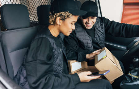 Two couriers sitting in van checking information on box for delivery