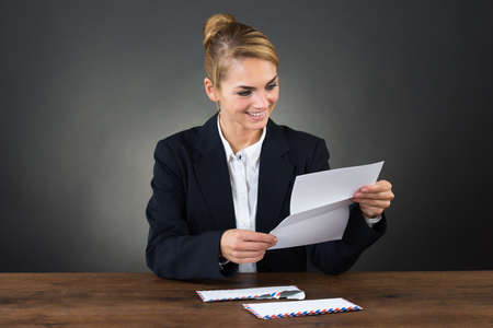Smiling young businesswoman reading letter at desk while sitting over gray background