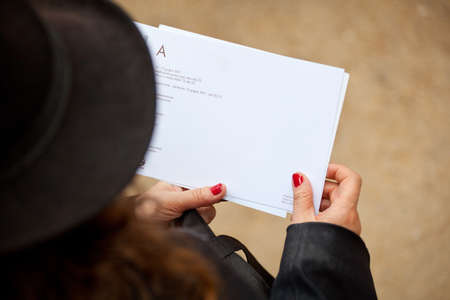 Close-up high-angle view of unrecognizable young woman holding in hands envelope with received letter sitting at table. Lady putting handwritten letter into envelope and closes it, selective focus.