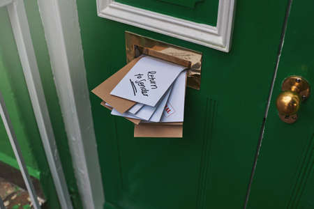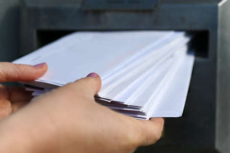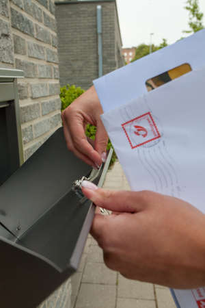 Close-up of womans hand holding envelope and inserting in or taking out of mailbox. High quality photo