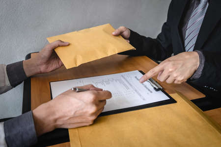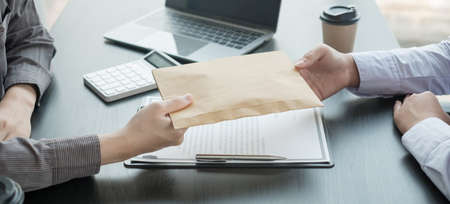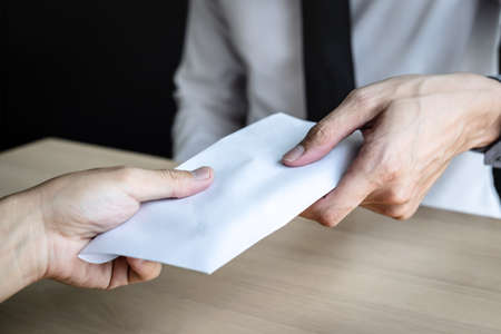 Dishonest cheating in business illegal money, Businessman giving bribe money in envelope to business people to give success the deal contract of investment, Bribery and corruption concept.