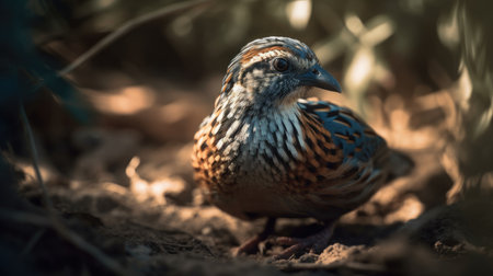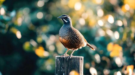 A stunning image of a vibrant quail bird perched on a wooden post, with a softly blurred background of green foliage and warm bokeh effects.